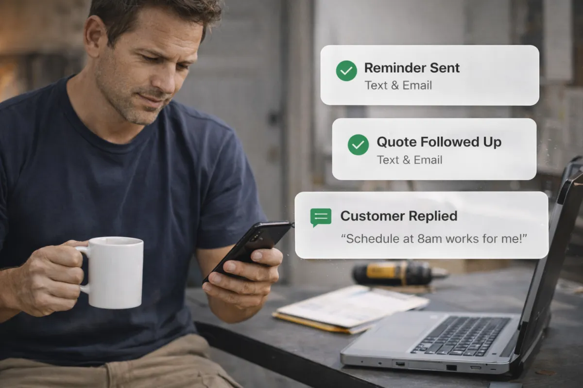 Automates estimate follow-ups, invoice reminders, and payment nudges.